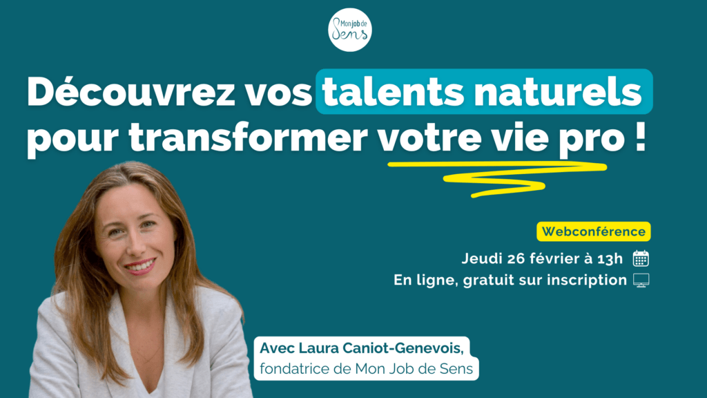 Découvrez la webconférence spéciale talents animée en exclusivité par Laura Caniot-Genevois, fondatrice de Mon Job de Sens et certifiée CliftonStrengths, l’outil de référence pour découvrir ses talents naturels. Depuis 2018, avec Mon Job de Sens elle a accompagné plus de 750 personnes à remettre du sens dans leur vie pro, en partant de ce qu’elles font le mieux — naturellement.